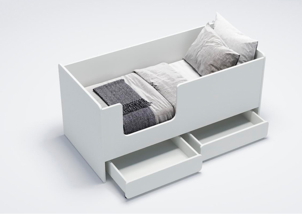 Особенностью данной модели являются два вместительных выкатных ящика, которые оборудованы прямоходными колесами. Эти ящики предоставляют дополнительное пространство для хранения игрушек, одежды и прочих детских принадлежностей, а прямоходные колеса обеспечивают легкость и удобство при их выдвижении.
